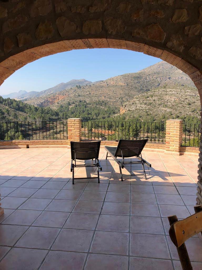 Mas la Pau liegt eingebettet in einer sanften Hügellandschaft, mit einem einzigartigen Weitblick ins Vall de Pop und in die umliegenden mediterranen Weingut-, Mandel- und Oliven- Plantagen, der Region LLIBER / Jalón an der Costa Blanca.